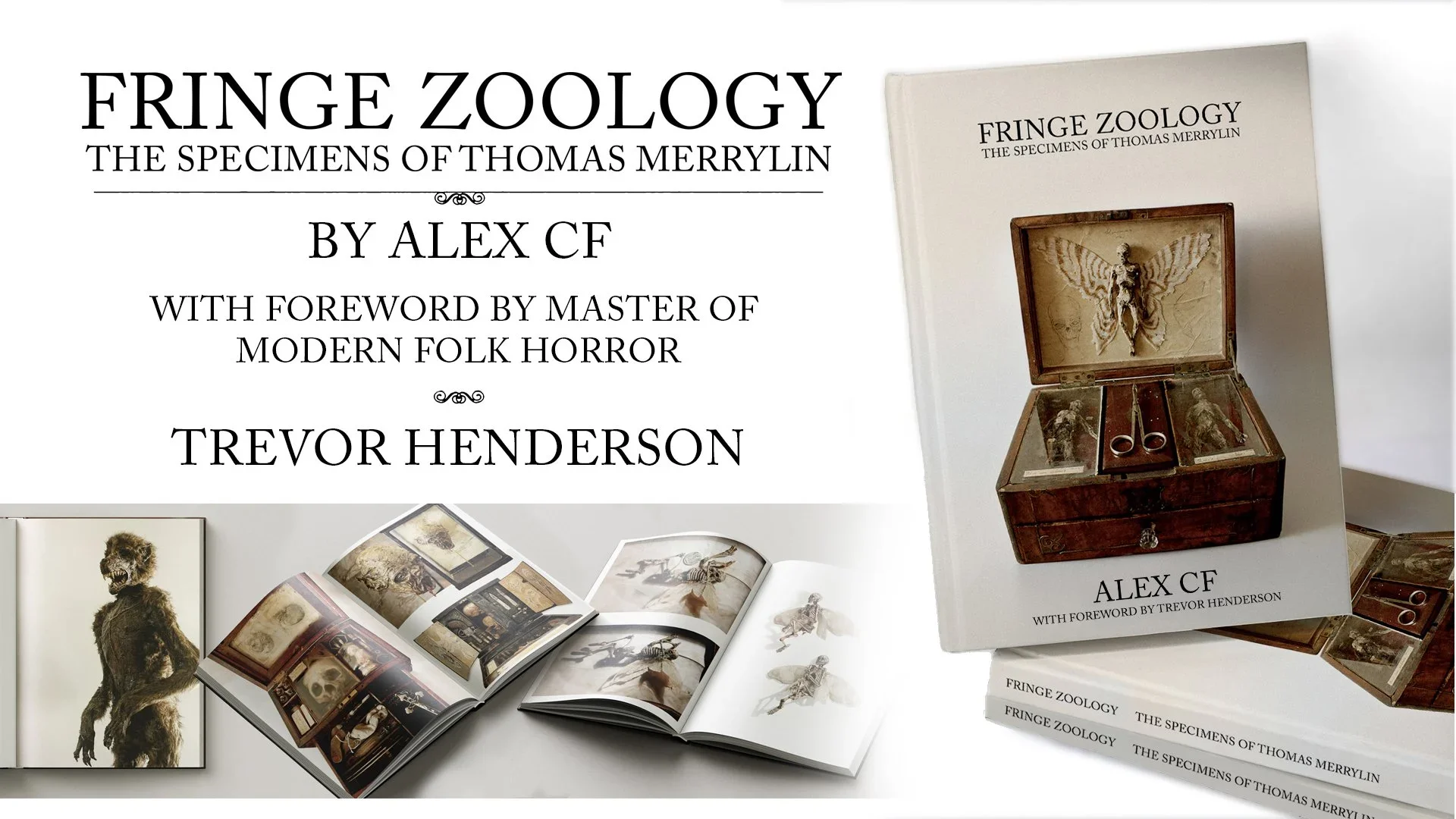 Over fifteen years in the making, Fringe Zoology: The Specimens of Thomas Merrylin is a 21 x 29 cm, cloth bound hardback book, with rich brown end pages and a dust jacket. Contained within are hundreds of photographs of specimens and artefacts, and the accompanying explanations of these items. Delve into the mythos of the collection -through esoteric maps, arcane items of the occult, species unseen in science and at its heart - the tale of a broken man.